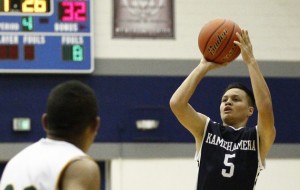 SPT – Kamehameha’s Jayden Zarriello shoots a three-pointer during the second half of a pre-season boys high school basketball game between the Leilehua Mules and the Kamehameha Warriors on Thursday, December 11, 2014 at Moanalua High School in Honolulu. (Honolulu Star-Advertiser/Jamm Aquino).