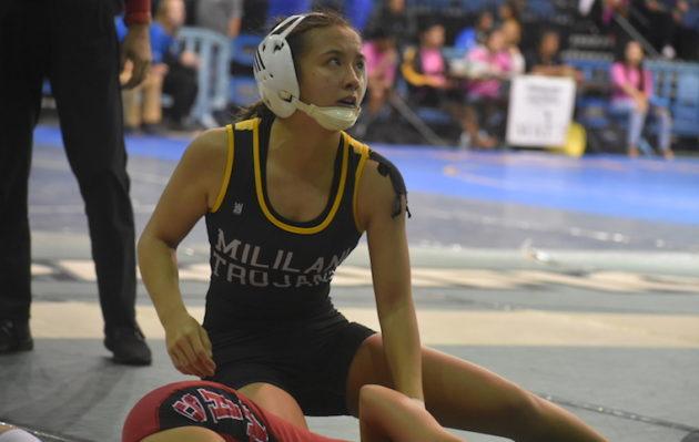 By Nick Abramo on February 21, 2020Nanea Estrella keeps on chugging. She needed just 13 seconds to beat Amber Cotter in the 132-pound preliminary round of the Texaco/HHSAA Wrestling State Championships on Friday at Blaisdell Arena. The Lahainaluna wrestler is going for her fourth state title, the biggest prize in Hawaii high school wrestling. Next up is Marcella Reynolds of Radford in the quarterfinals later today. “I’m feeling pretty good,” Estrella said after the win. “I’m feeling confident in my team and confident in myself and […]