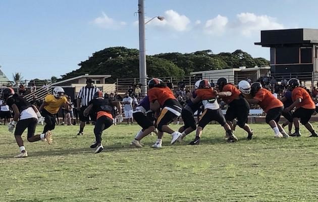 By Paul Honda on July 25, 2019There could have been some rough going for the Campbell Sabers in chapter one of their 2019 football season. Instead, the Sabers excelled precisely where questions about inexperience were looming. Sophomore quarterback Blaine Hipa rifled three touchdown passes and the young offensive line did not allow a sack during a tri-scrimmage with Damien and Kaimuki on Thursday night in Ewa Beach. It was an especially memorable night for first-year Sabers offensive coordinator Jaymason Lee. He got his first taste of […]