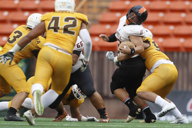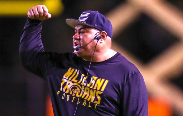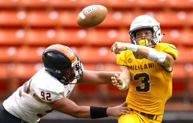 By Paul Honda on November 17, 2018This time, the Saint Louis Crusaders saved their celebration jigs for post-game. No. 1 Saint Louis posted a 49-22 win over No. 4 Kahuku in the semifinals of the First Hawaiian Bank/HHSAA Football State Championships on Friday night at Aloha Stadium. Next week, the Crusaders will face OIA Open Division champion Mililani for the state title, but for at least a little while, they’ll enjoy the moment. “I’m glad it’s over. We were very fortunate to win,” Saint Louis coach […]