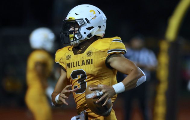 By Paul Honda on September 22, 2018No. 4 Mililani 35, Waianae 0, FINAL At John Kauinana Stadium Waianae (0-5, 0-3) 0 0 0 0 — 0 Mililani (5-2, 3-0) 0 7 21 7 — 35 MIL—Kilifi Malepeai 8 pass from Dillon Gabriel (Kekoa Kuloloia kick) MIL—Maka Hill 5 pass from Gabriel (Kuloloia kick) MIL—Kai Banks 7 pass from Gabriel (Kuloloia kick) MIL—Dreyston Barquis 27 pass from Gabriel (Kuloloia kick) MIL—Barquis 7 pass from Gabriel (Kuloloia kick) JV—Waianae 37, Mililani 28. RUSHING—Waianae: Kaai Tambaoan-Kaeo 15-32, Zefften Thompson-Avilla […]