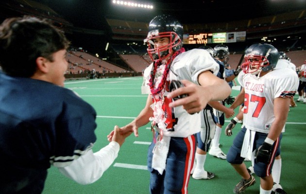 By Jerry Campany on December 31, 2017During Saint Louis’ streak of 13 consecutive Prep Bowls, 1996 was a rare year. Despite the Crusaders’ continued success, the Star-Bulletin looked to two other ILH schools for its offensive and defensive players of the year. Punahou receiver Tafiti Uso, who had six 100-yard receiving games, including a career-high 192 yards in a three-point win over Kamehameha, earned the top offensive honors. ‘Iolani defensive lineman Ed Ta’amu was the defensive player of the year. Saint Louis wasn’t completely shut out […]