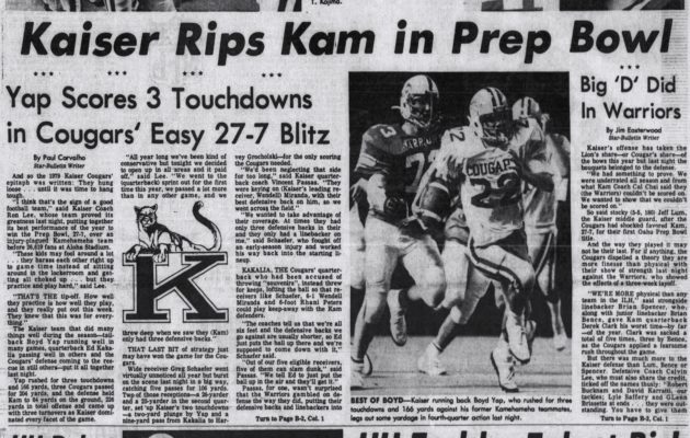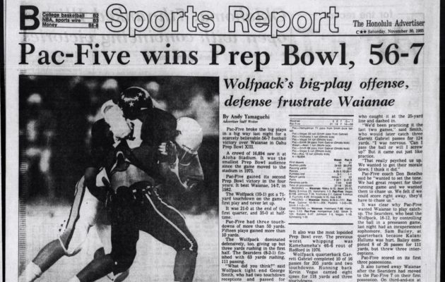 By Jerry Campany on December 7, 2017As the 2017 Honolulu Star-Advertiser’s football All-State team release draws near, periodically we are going to ask a spreadsheet to generate a random number between 1947 and 2016. Whichever year pops up, we will post that season’s all-star pages here. 1990 was the year of the two best rushing performance in the history of the state. Kahuku’s Mark Atuaia, who held the career rushing record as the only back to run for more than 4,000 yards for eight more years, […]