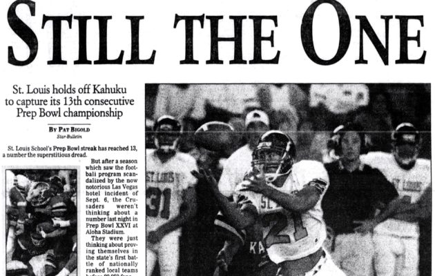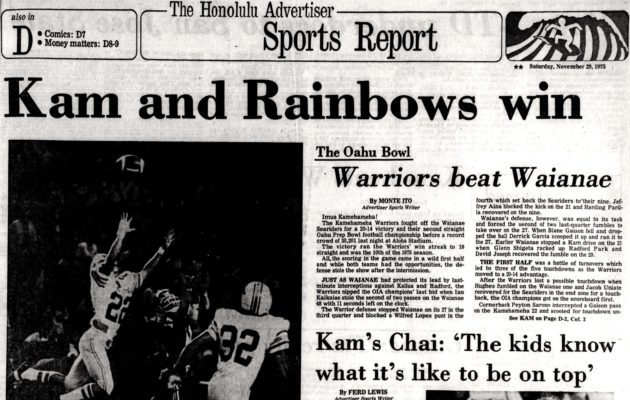 By Jerry Campany on December 2, 2017As the 2017 Honolulu Star-Advertiser’s football All-State team release draws near, periodically we are going to ask a spreadsheet to generate a random number between 1947 and 2016. Whichever year pops up, we will post that season’s all-star pages here. We continue with 1975, the year Blane Gaison and Kamehameha ruled the roost over OIA champion Waianae. Mililani joined the OIA in the first year of Aloha Stadium, which helped the league draw 150,719 fans after getting 97,969 the previous […]