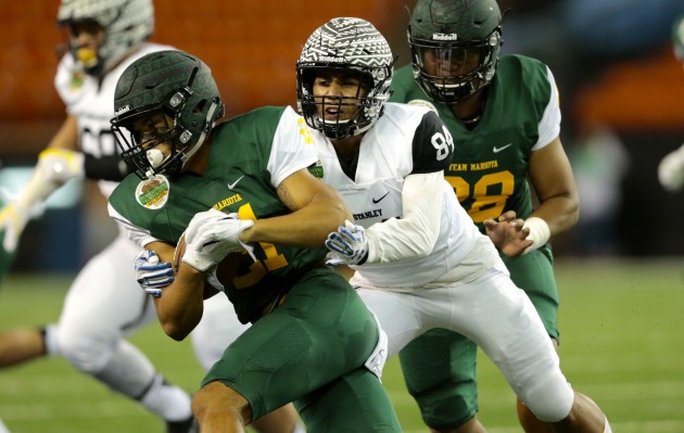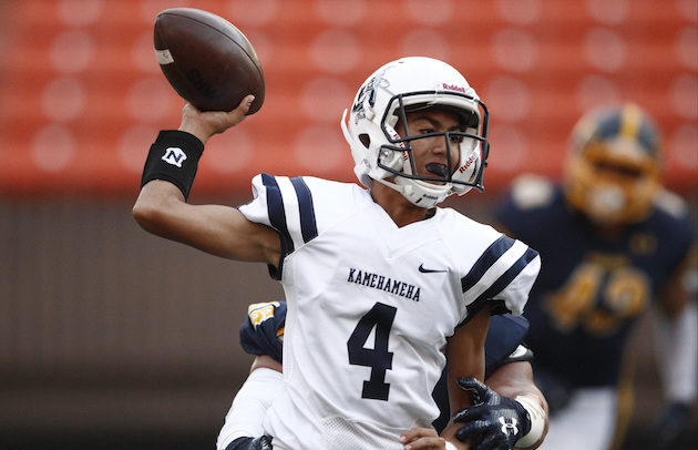 By Billy Hull on October 5, 2017Kamehameha defensive back Kalamaku Kuewa has been invited to participate in the 2018 Polynesian Bowl on Saturday, Jan. 20, at Aloha Stadium. Kuewa, a 6-foot, 185-pound safety, has intercepted at least one pass in all seven games for the Warriors this season. He also forced a fumble in a 23-12 loss to Saint Louis last Friday and had two picks in the season-opening win against Farrington, returning one 71 yards for a score. Kuewa is the second player from Kamehameha […]