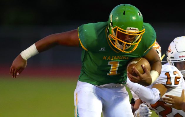 By Noelle Kakimoto on September 8, 2019The Kaimuki Bulldogs may have added their fourth victory out of five games following their 27-7 win over Nanakuli on Saturday night at Skippa Diaz Stadium, but they’re not settling down yet. The Bulldogs showed up with confidence as sophomore QB Jayden Maiava ran a 29-yard keeper into the end zone for the team’s first score at the 10-minute mark. Despite Nanakuli senior QB Sedric Crawford’s game-tying touchdown late in the first quarter, the Golden Hawks offense wouldn’t see the […]