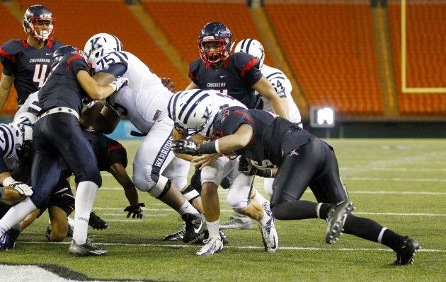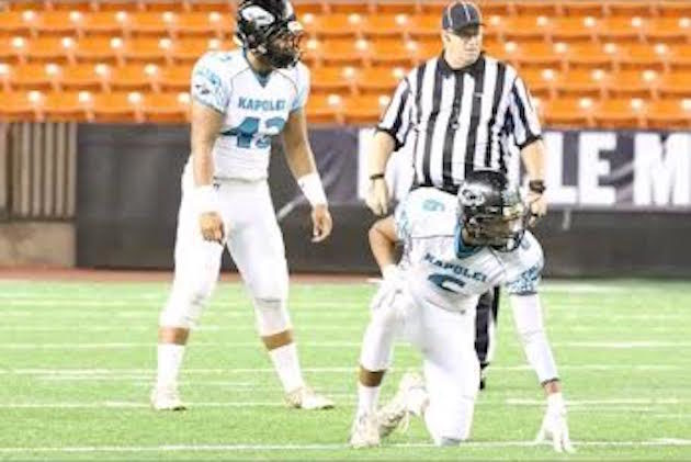 By Hawaii Prep World on August 4, 201710:17: Game over. Final score, KAPOLEI 23, CAMPBELL 7. 10:13: Kapolei drives, but Pokii Adkins-Kupukaa picks off a pass in his own end zone. Sabers ball. 10:05: Campbell punts. 6:16 left in game. 9:57: Aaron Faumui sacks Kaipo in the end zone for a safety. KAPOLEI 23, CAMPBELL 7, 10:18 left in fourth quarter. 9:50: Titus Mokiao-Atimalala splits two defenders down the left sideline to catch a 35-yard touchdown pass from Kalaola. Bantolina kicks the extra point. KAPOLEI 21, CAMPBELL […]