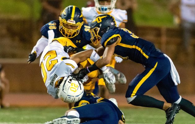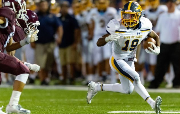 By Paul Honda on September 20, 2018The best — and closest — Open Division showdown involving defending state champion Saint Louis in the first half of the season was a zany exchange of big plays by Punahou’s offense, defense and special teams with the Crusaders’ uneven defensive performance. Then Crusaders defensive tackle Faatui Tuitele emerged with 9:01 to go in the second quarter, and everything changed. Down 21-14, the Crusaders took command of the line of scrimmage en route to a 35-28 victory at Aloha Stadium.