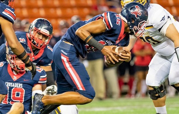 By Paul Honda on November 17, 2018This time, the Saint Louis Crusaders saved their celebration jigs for post-game. No. 1 Saint Louis posted a 49-22 win over No. 4 Kahuku in the semifinals of the First Hawaiian Bank/HHSAA Football State Championships on Friday night at Aloha Stadium. Next week, the Crusaders will face OIA Open Division champion Mililani for the state title, but for at least a little while, they’ll enjoy the moment. “I’m glad it’s over. We were very fortunate to win,” Saint Louis coach […]