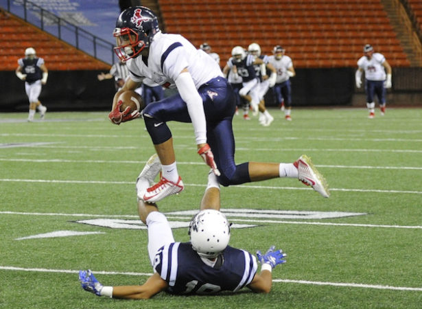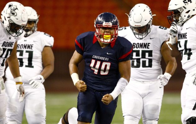 By Paul Honda on October 22, 2017Scoring highlights, No. 1 Saint Louis vs. No. 4 Kamehameha, Interscholastic League of Honolulu Division I playoffs, Aloha Stadium, Saturday, Oct. 21, 2017. Score: Crusaders 38, Warriors 2.