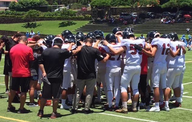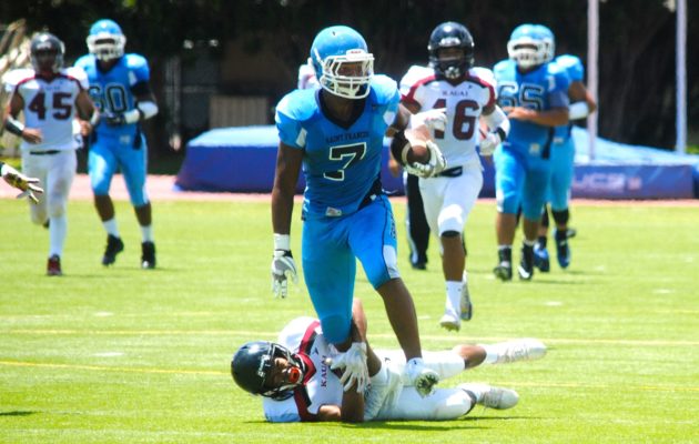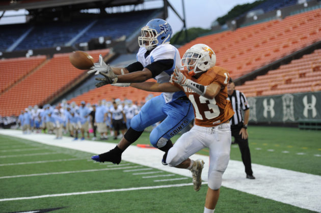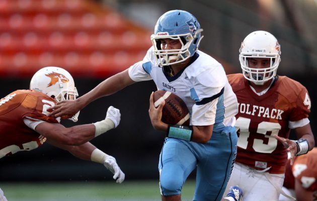 By Paul Honda on September 1, 2017Maybe this was a turning point for the St. Francis Saints. The immense challenge by Pac-Five. The injuries at running back. The Saints had to extend beyond their comfort zone on Friday night, relying on the aerial acumen of Bubba Akana, who was 22-for-31 for 196 yards, four touchdowns — and no interceptions — in a come-from-behind 35-21 win at Aloha Stadium. It was just one chapter in the evolution of the Saints, who struggled to run the ball consistently. […]