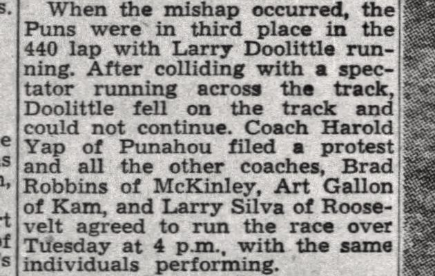 By Jerry Campany on January 1, 2021On this date in 1932, young Yetsuo Higa added to his growing legend. Higa ran five miles in 30 minutes, 25.6 seconds to finish third in the annual Diamond Head run. The event was a largely military affair, but Higa helped his Leilehua Mules won the civilian trophy aided by teammates Raymond Chinen and Yunjo Tanaka. Six Mules finished in the top 25. Higa, who was born in Honokaa, was regarded as one of the best athletes in Wahiawa at […]