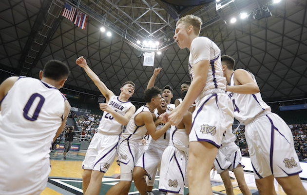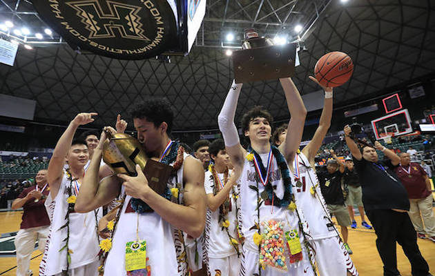 After 35 years, the Maryknoll Spartans clutched the boys basketball state championship trophy. A 50-34 win over Punahou made it official at Stan Sheriff Center.