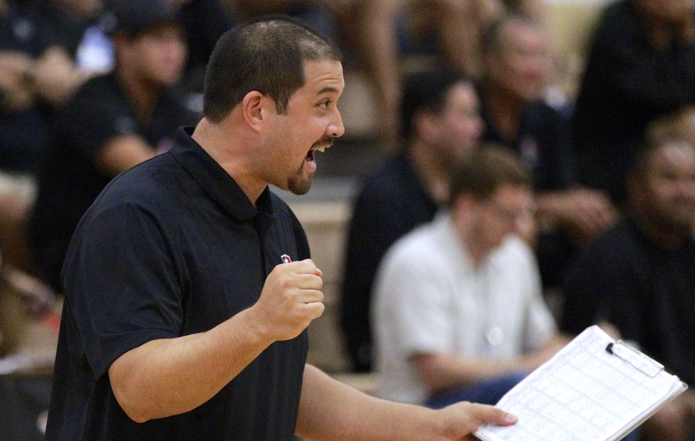 Iolani’s head coach Kainoa Obrey encourages his team in the final points before winning 2-0 against Kamehamhea in a ILH girl’s volleyball game at the Iolani School gym in Moiliili on Tuesday, September 15, 2015.