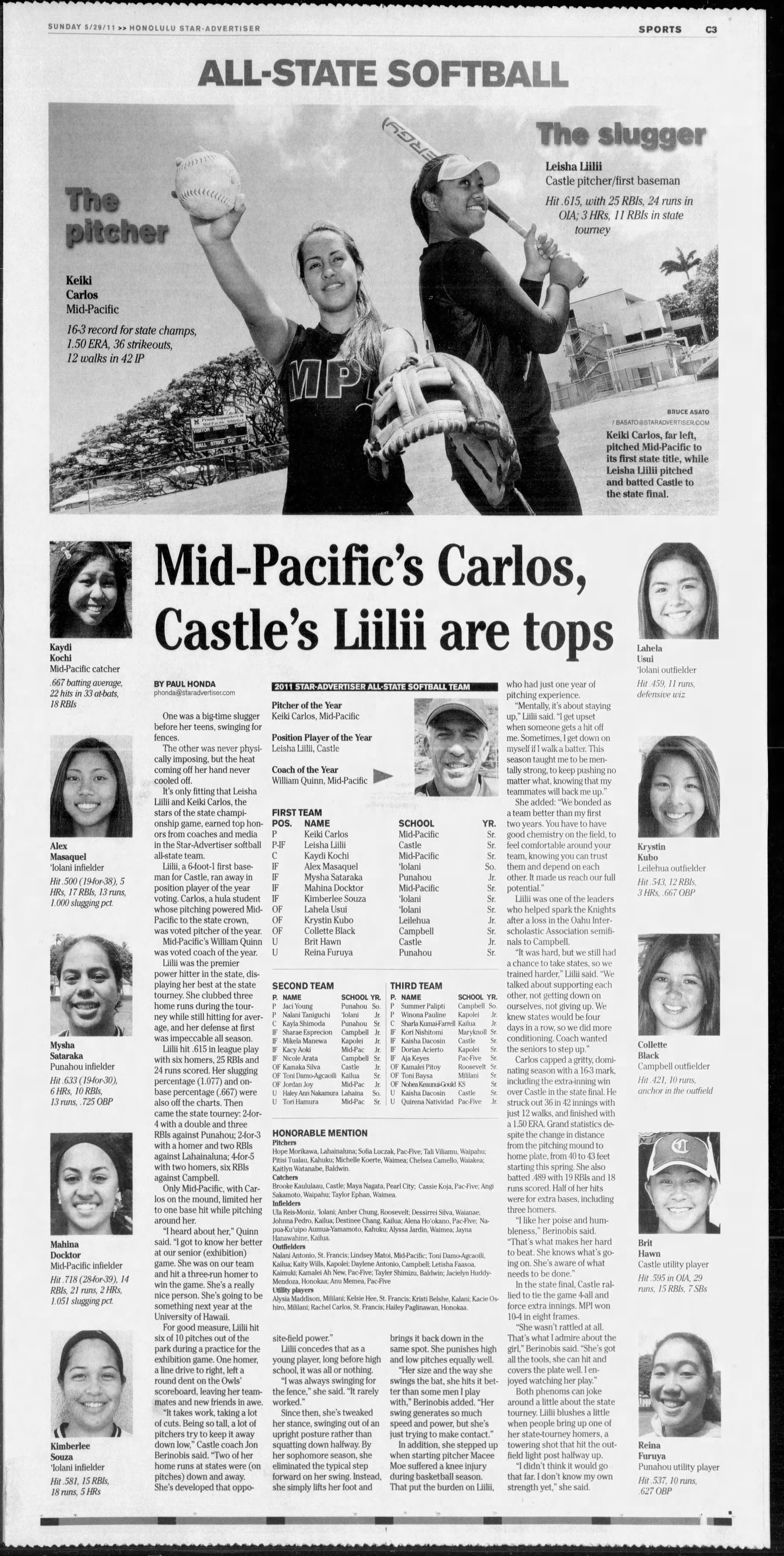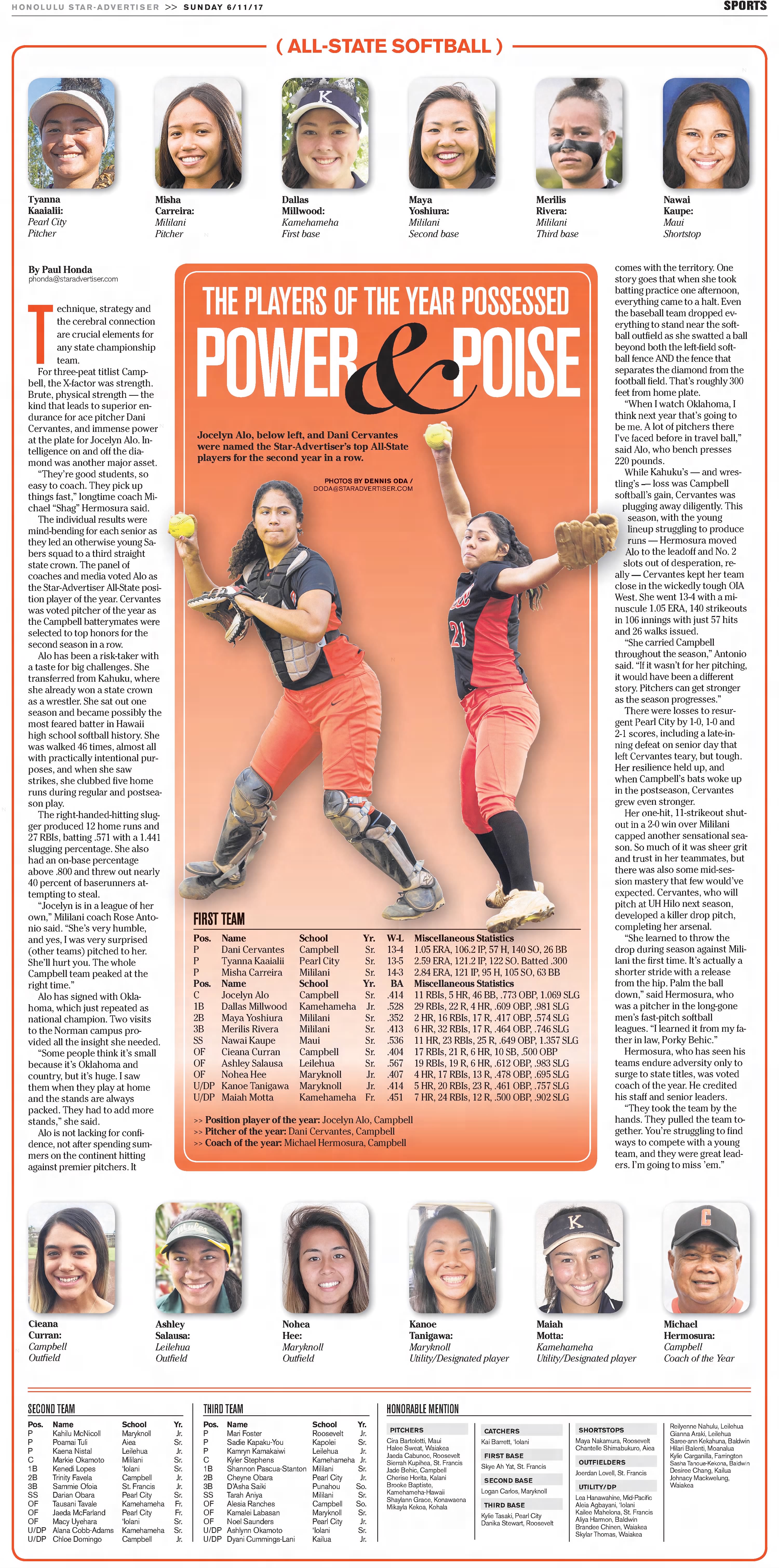 Although there are still dominant pitchers, this decade is marked by sluggers giving them a challenge. Heavy-hitting pitchers like Katie Manuma, Keiki Carlos and Leisha Liilii gave way to bombers like Mysha Sataraka of Punahou and Mid-Pacific’s Nicole Lopez but all came to a head when Jocelyn Alo took her bat from Kahuku to Castle and repeated as position player of the year two years in a row. If you want to see how time is flying by, check out the flip phone in Manuma’s hand in 2010.