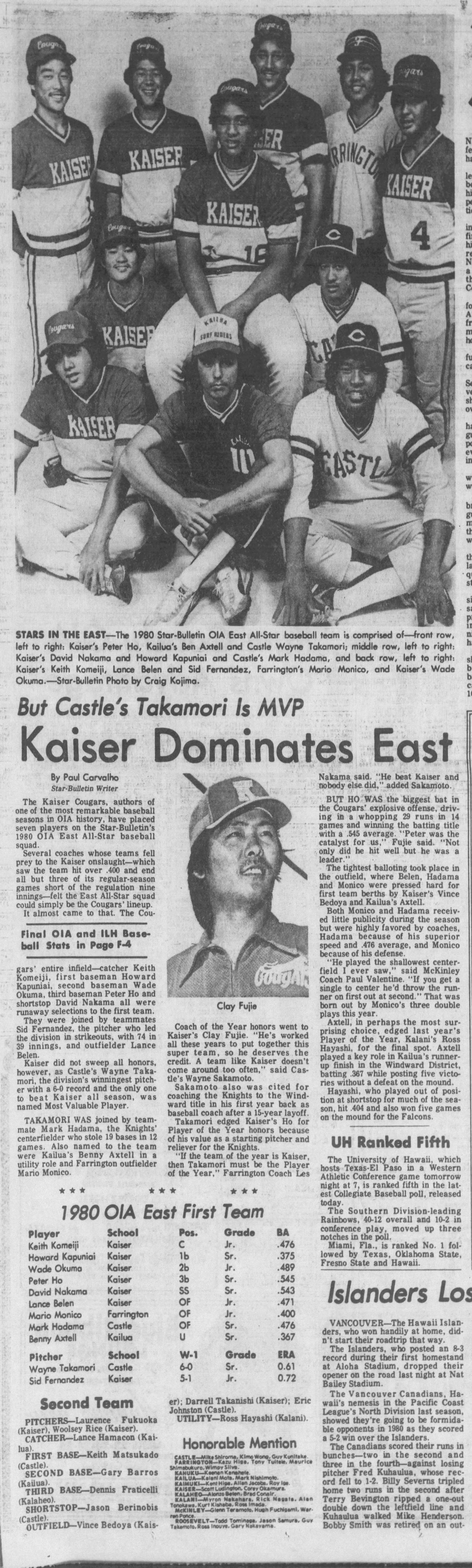 The OIA didn’t have much success but might have had the best battery of the decade with Kaiser’s Sid Fernandez and Keith Komeiji willing their Cougars to an OIA East title early in the decade and a state title in 1981.