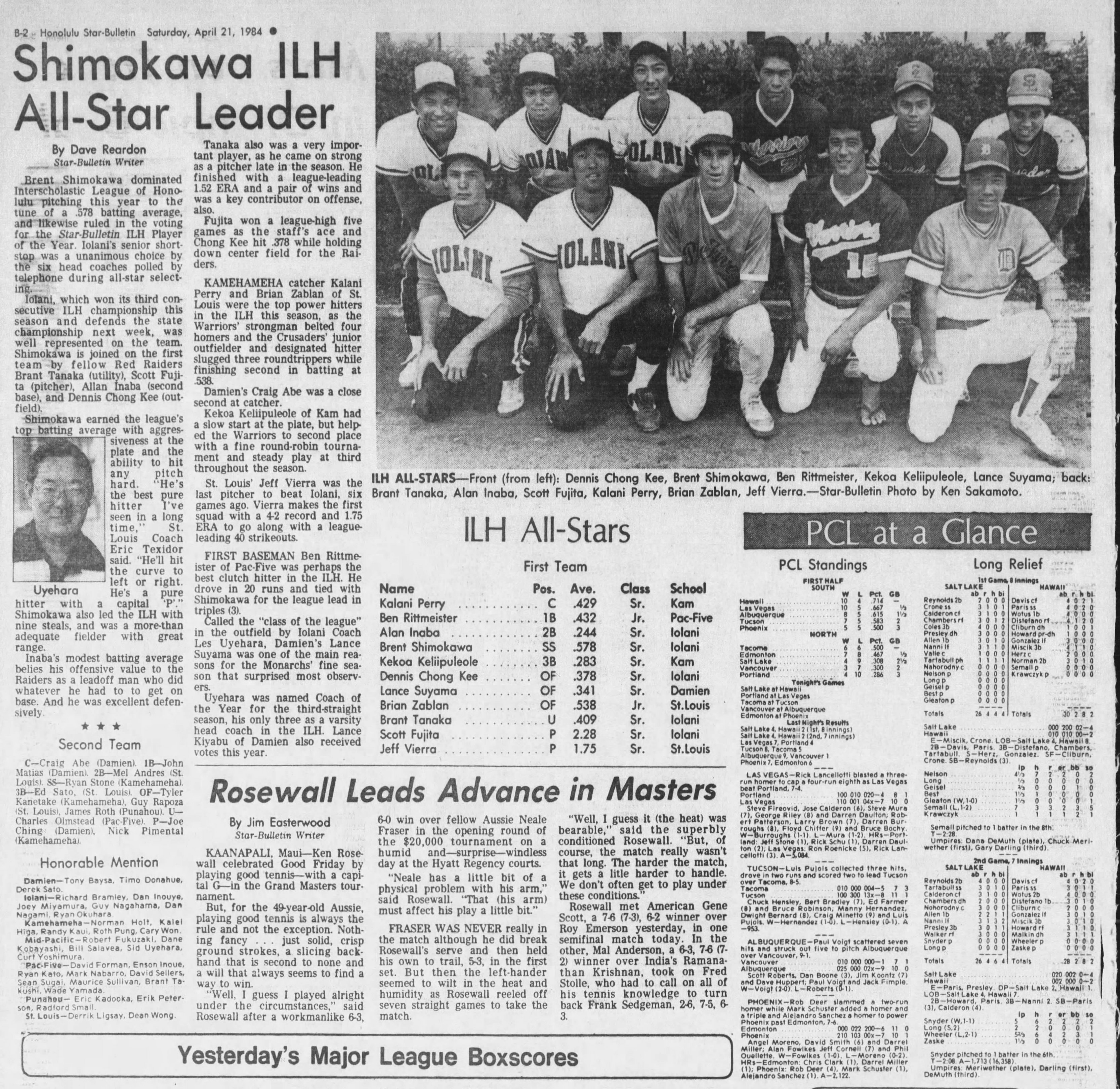 Familiar names to look for include Joey Meyer of Punahou, Kaimuki shortstop Mark Rasmussen, Kalaheo’s Carl Fraticelli, Iolani catcher Dean Yonamine to go with pitcher Mike Fetters, Damien shortstop Timo Donahue, Punahou’s Billy Blanchette, Benny Agbayani of Saint Louis, Franz Yuen of Punahou and Roosevelt’s Matt Apana.