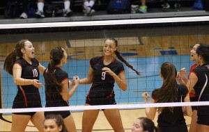 The Iolani Raiders celebrated a kill by teammate Iolani outside hitter Elena Oglivie (9) during the first set of the HHSAA Division I Girls Volleyball state championship match against the Kamehameha-Kapalama Warriors on Saturday night.