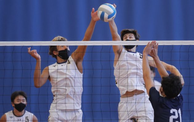 Keau Thompson and Nate Loose were highly active on defense as Punahou swept Kamehameha for the ILH boys volleyball title. Jamm Aquino/Star-Advertiser (May 4, 2021)