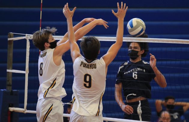 Punahou’s Noa Haine and Nate Loose converge on Kamehameha’s Kruse Aea during the ILH boys volleyball championship at Hemmeter Fieldhouse. Jamm Aquino/Star-Advertiser (May 4, 2021)
