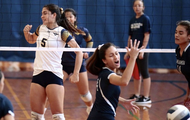 Punahou outside hitter Keliiakekaipukaamaka McComber (5) reacts after a point against the Kamehameha-Kapalama Warriors during the first set of a girls ILH volleyball game between the Punahou Buffanblu and the Kamehameha-Kapalama Warriors on Saturday, October 15, 2016 at Hemmeter Field House in Manoa.