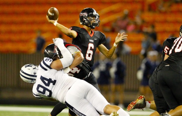 Iolani quarterback Tai-John Mizutani (6) throws the football during the first half of an ILH football game between the Kamehameha-Kapalama Warriors and the Iolani Raiders on Friday, September 30, 2016 at Aloha Stadium in Halawa.