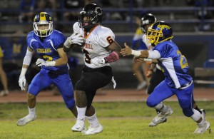 2015 October 10 SPT – HSA PHOTO BY BRUCE ASATO – Campbell v Kaiser FB – Campbell’s Terell Johnson eludes Kaiser defenders for yardage in the second quarter of the Campbell vs Kaiser football game at Kaiser Stadium, Saturday, October 10, 2015.
