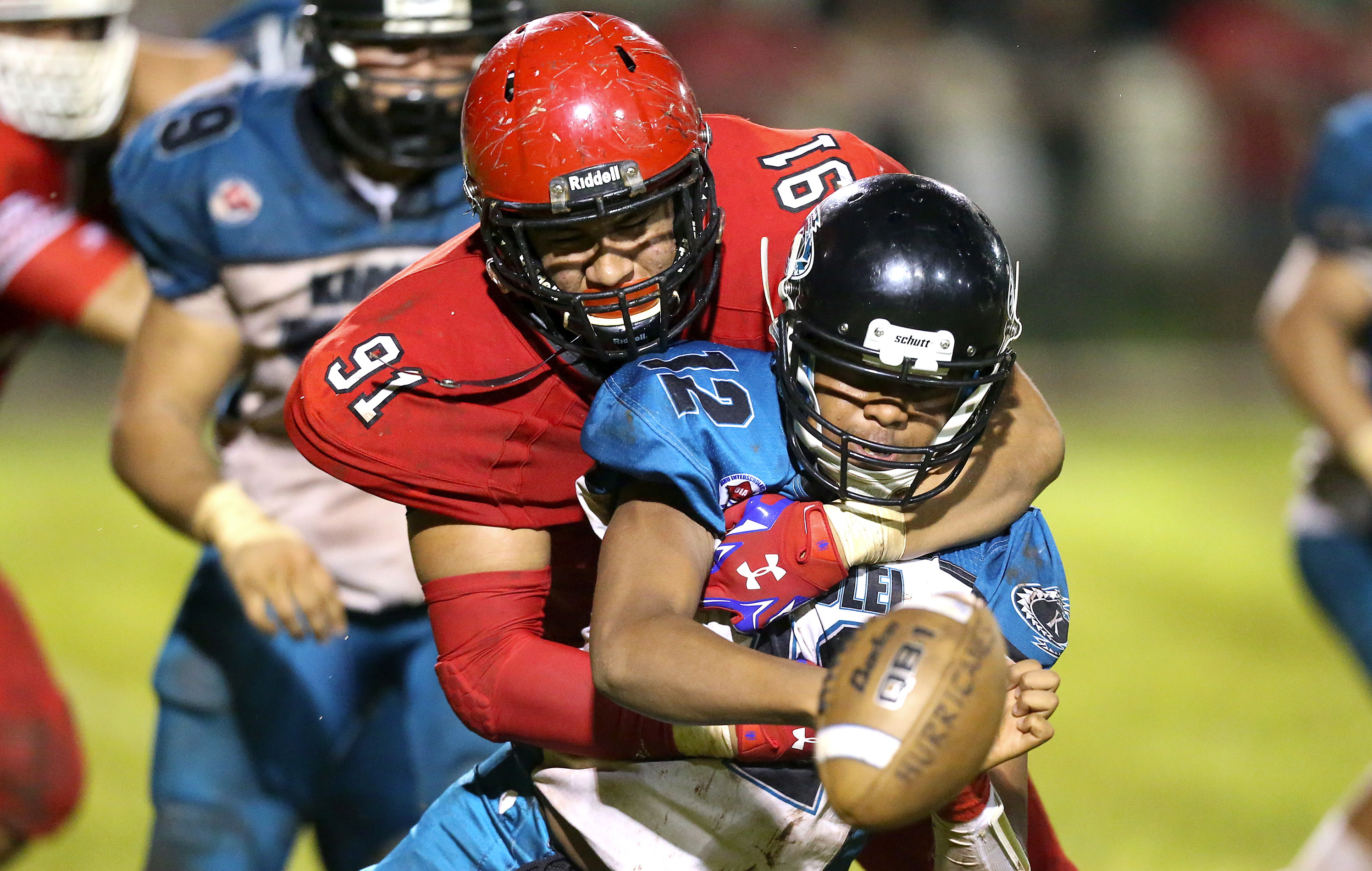 2015 October 17 SPT – Kahuku’s Aliki Vimahi (91) sacks Kapolei’s quarterback Taulia Tagovailoa (12) forcing the ball loose, but play was called down at the 1 yard line, during the third quarter of the game on Saturday at Kahuku High School.