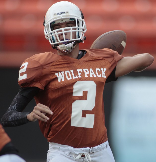 2014 October 3 SPT – Pac-Five Wolfpack’s Quarterback Ryan Johnson looks for an open man against the Punahou Buffanblu in the first quarter of an ILH boy’s football game at Aloha Stadium in Halawa on Friday, October 3, 2014.