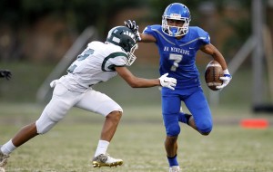 2016 September 30 SPT – HSA Photo by George F. Lee / GLEE@STARADVERTISER.COM Moanalua Na Menehune football player Ryan Ramones put a stiff arm on Aiea Na Alii Babu Capanang in a game on Friday.