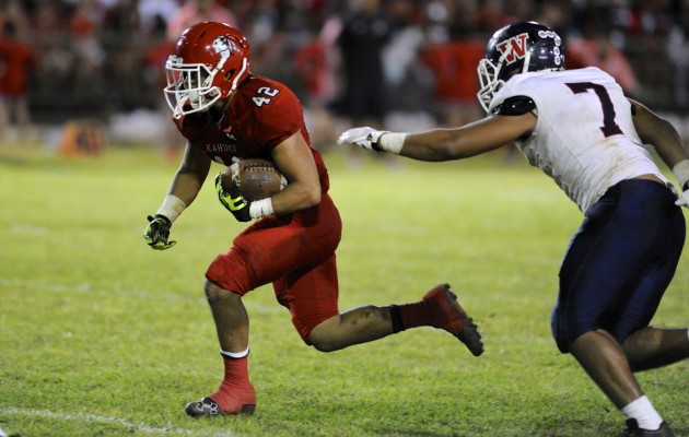 2016 August 26 SPT- HSA PHOTO BY BRUCE ASATO – Kahuku’s Elvis Vakapuna gets yards inside the 20 in the second quarter of the Waianae vs Kahuku football game at Kahuku field, Friday, August 26, 2016.