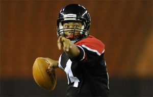 2013 August 10 SPT – Prep FB Iolani – Iolani quarterback Easton Tsubata points to a receiver during first quarter action in the Kalani vs Iolani football game. HSA photo by Bruce Asato