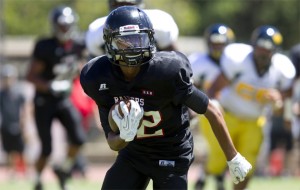 SPT IOLANI LEILEHUA – 17 AUGUST 2013- Iolani’s wide receiver Keoni-Kordell Makekau brought in a touch down in the first quarter of Saturday’s game against Leilehua. Honolulu Star-Advertiser photo by Cindy Ellen Russell