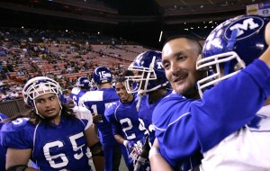 Moanalua head coach Arnold Martinez hugs #99- Jordan Tanioka after their win.
