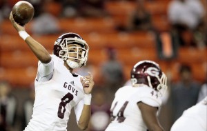 Farrington quarterback Bishop Rapoza (8) throws the football during the first half of the 2016 OIA Division I football championship game between the Kahuku Red Raiders and the Farrington Governors on Friday, October 28, 2016 at Aloha Stadium in Halawa.