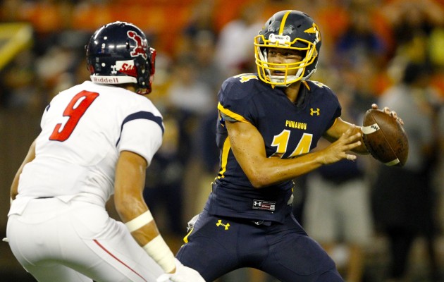 Punahou quarterback Nick Kapule (14) looks to pass while under pressure from Saint Louis linebacker Isaiah Feary (9) during the first half of an ILH football game between the Punahou Buffanblu and the Saint Louis Crusaders on Friday, September 9, 2016 at Aloha Stadium in Halawa.