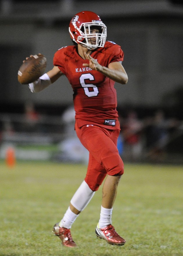 2016 August 26 SPT- HSA PHOTO BY BRUCE ASATO – KahukuÕs Sol-Jay Maiava eyes a receiver in the first quarter of the Waianae vs Kahuku football game at Kahuku field, Friday, August 26, 2016.