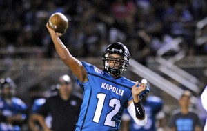 2016 August 5 SPT – HSA PHOTO BY BRUCE ASATO – Kapolei’s Taulia Tagovailoa throws a pass in the second quarter of the Campbell vs Kapolei football game at Kapolei High School field, Friday, August 5, 2016.