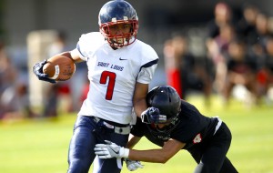 Saint Louis slotback Noah Alejado (7) is brought down by Iolani defensive back Taylor Spencer (4) during the first half of an ILH football game between the Iolani Raiders and the Saint Louis Crusaders on Friday, September 23, 2016 at Iolani School in Moiliili.