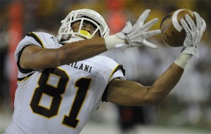 2014 November 21 SPT – State FB D1 – Mililani’s Kalakaua Timoteo catches a touchdown pass in the second quarter of the Mililani vs Punahou football game for the HHSAA Division 1 football championship at Aloha Stadium. HSA photo by Bruce Asato