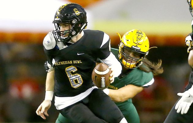 Team Mauka quarterback Chevan Cordeiro tried to avoid Team Makai's Drew Faoliu during the first quarter of the 2018 Polynesian Bowl. Photo by Jay Metzger/Special to the Star-Advertiser.