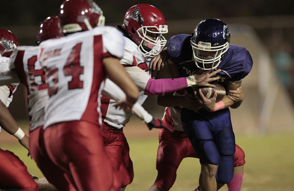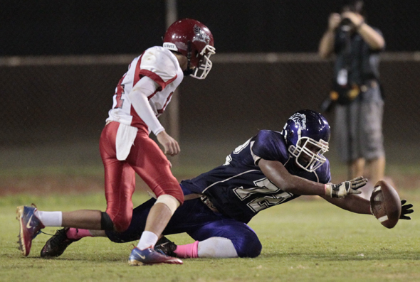 Pearl City’s Kordell Vaa pounced on a fumble by Kalani quarterback Noah Brum, left, in the first half.
