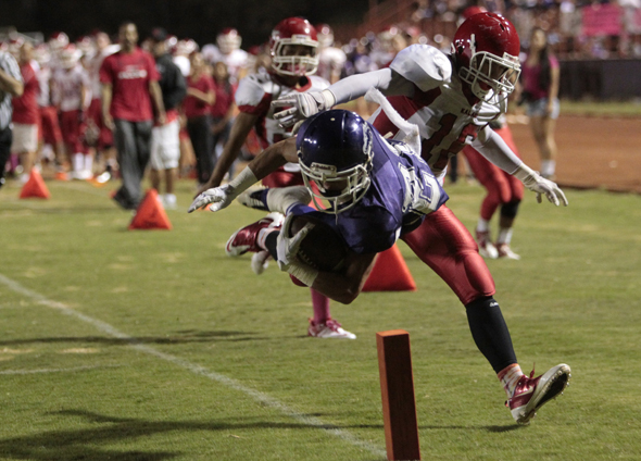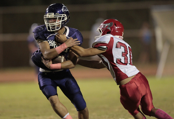 Pearl City’s Tanner Tokunaga soared for the end zone but came up just short ahead of Kalani’s Isaac Akiona in the first half.