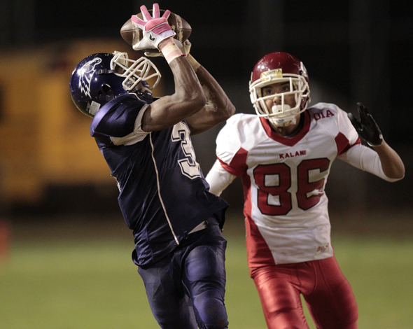 Pearl City’s Daicorri Briscoe hauled in a pass ahead of Kalani’s Don Hamatake during the first half.