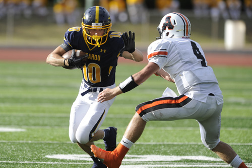 Punahou rolled over West Anchorage 48-0. >> Read the story. Punahou receiver Austin Sivik looked to put a stiff arm on West Anchorage’s Conor Feckley after a reception in the second quarter on Friday, August 10, 2012. (Bruce Asato / basato@staradvertiser.com