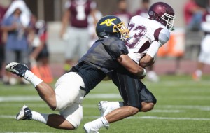 SPT – Punahou’s Ronley Lakalaka stops a Farrington player during a pre-season scrimmage between the Farrington Governors and the Punahou Buffanblu on Saturday, August 2, 2014 at Punahou School in Manoa. (Honolulu Star-Advertiser/Jamm Aquino).