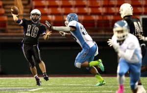 Damien quarterback Marcus Faufata-Pedrina (10) throws while being pressured by St. Francis defensive end Tevita Otuvaka (99) during the second half of the ILH Division II football championship game between the St. Francis Saints and the Damien Monarchs on Friday, October 21, 2016 at Aloha Stadium in Halawa. Damien won 20-12.