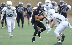 2015 November 14 SPT – HSA PHOTO BY BRUCE ASATO -Radford’s Jake Walter (4) gets some yardage after the catch with Konawaena’s Jordan Kikugawa (14) closing on the play in the first quarter of the Konawaena vs Radford in the HHSAA football division 2 playoffs at Roosevelt HS stadium, Saturday, November 14, 2015.