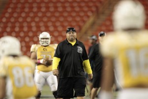 Mililani’s head coach Rod York watches his team warm up prior to an OIA playoff football game between the Mililani Trojans and the Waianae Seariders on Friday, October 23, 2015 at Aloha Stadium in Halawa.