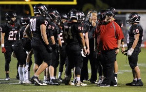 2016 November 4 SPT – HSA Photo by Bruce Asato – Iolani’s head coach Wendell Look huddles with his offense in the fourth quarter of the Iolani vs Moanalua football game in the first round of the HHSAA Division I Football State Championships at Roosevelt High School’s Ticky Vasconcellos Stadium, Friday, November 4, 2016.